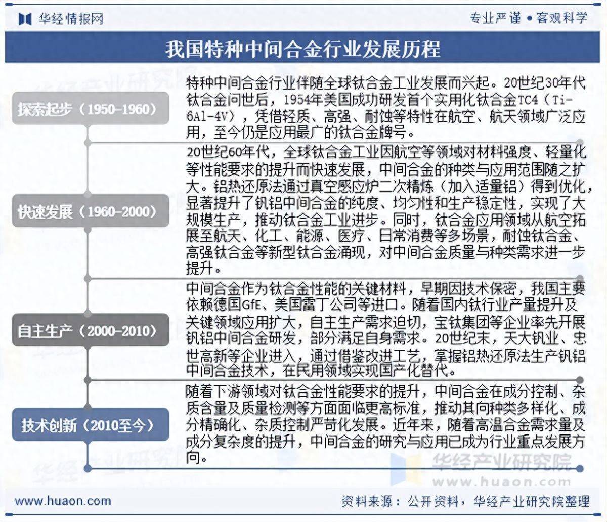 特种中间合金行业随钛合金工业发展而兴起,20世纪30年代钛合金问世后,1954年TC4(Ti-6Al-4V)的实用化推动其工业化,中间合金因解决钒单质添加难题成为关键材料。20世纪60年代铝热还原法通过真空精炼优化,实现钒铝中间合金大规模生产,同时多元中间合金逐步成熟。我国早期依赖进口,后经宝钛集团、天大钒业等企业攻关,2008年突破“两步法”工艺,实现自主生产。近年来,随着钛合金性能要求提升,中间合金向成分精确化、杂质严控化发展,并逐步拓展至高温合金领域,但我国高端高温合金仍存50%以上进口依赖口袋超盘,中间合金研究应用成行业重点。