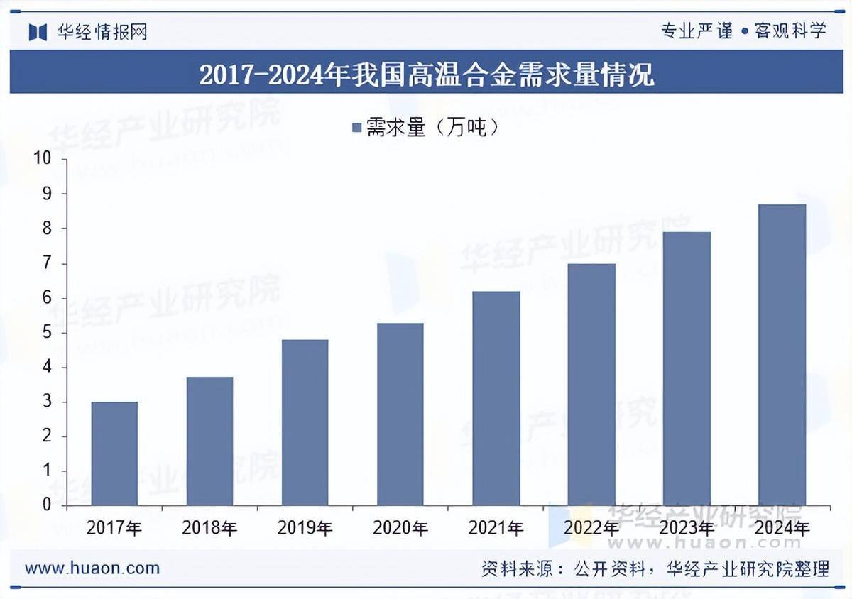 钛合金、高温合金行业的发展对中间合金的发展起到了直接的驱动作用。航空航天领域是钛合金、高温合金的主要应用市场,随着航空航天产业的快速发展,对轻量化、耐高温等高性能合金的需求不断增加,带动了中间合金行业的发展。据统计2024年我国高温合金市场需求量约为8.7万吨,2017-2024年CAGR约为16.43%。