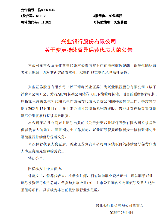 本公司于近日收到兴业证券出具的《关于变更兴业银行股份有限公司持续督导保荐代表人的函》。因张翊工作变动,兴业证券现委派徐蕊接替张翊继续履行持续督导保荐义务。