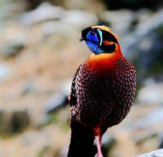 雄鸡全身长有灰色眼睛状的斑点,远远看去就像身上长有很多双眼睛;羽色十分华丽,深栗红色羽毛宛如锦缎一般雍容华贵。