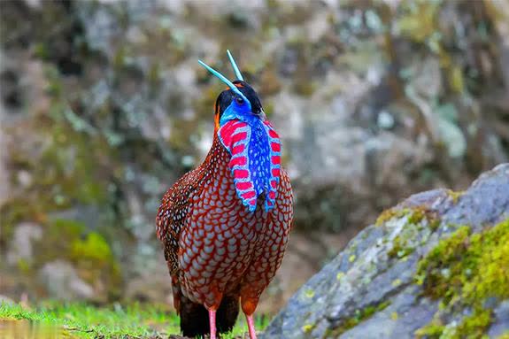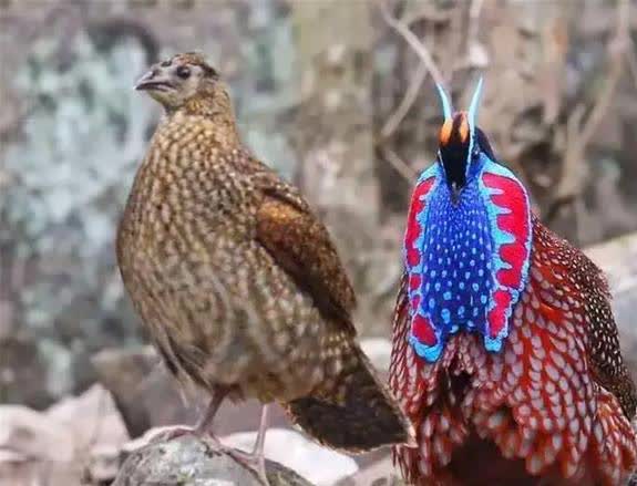平时雄鸡的肉质角藏而不露,头顶部只能看到长长的羽冠,肉裙也收缩在喉下。一旦进入繁殖季节,雄鸡头部一对绿蓝色肉质角就不断充气,膨胀,逐渐从头部延长,喉下部钻蓝色肉裙也慢慢变大而艳丽,看上去就像脖子下吊了一个 “大水囊”。